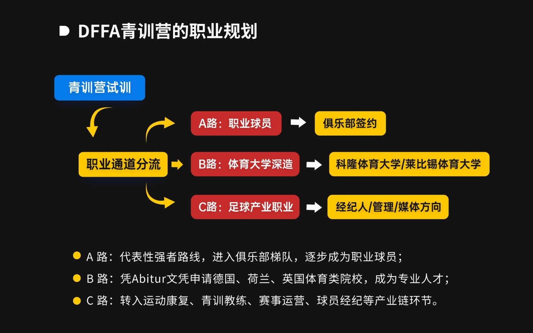关于我们 公司介绍 莱茵德拓(DETOCH RHEIN)是一家专注于中小学生足球特长发展的德国留学与青训交流服务机构,我们致力于打造“足球+教育+职业规划”一体化的国际化成长路径,帮助有潜力的青少年迈向职业足球之路,打开通往欧洲高水平足球舞台的大门。我们不仅输送有潜力的少年踏上德国高水平足球训练场,更致力于为他们铺设一条从校园球场通往欧洲职业联赛舞台的可持续发展之路,让足球天赋在严谨体系与广阔平台上真正绽放价值。 德国足球学校 我们与德国知名青训机构DFA(德意志足球学院)、DFI(德意志足球学校)深度合作,依托德国严谨的青训体系,共同成立为学员提供专业、系统的训练与选拔平台。同时,我们携手拜仁、多特、法兰克福、门兴等德甲俱乐部,引入其教练团队驻训支持,共享顶级青训资源,并每年吸引超过50位俱乐部球探亲临选拔营发掘人才。 青训选拔与发展路径 我们每年定期组织赴德青训选拔营,邀请持有UEFA Pro/DFB A级执教资质的德国职业教练进行评估与训练。通过系统选拔,优秀学员将有机会进入德甲及其他德国职业俱乐部青训体系。 教育与职业化并重 莱茵德拓将德国“双元制教育”引入青少年足球培养体系,学员在提升足球竞技能力的同时,也能接受德国高质量的文化教育,实现足球与学业的双轨发展。我们不仅关注孩子们的球场表现,更注重他们未来的职业通道建设。